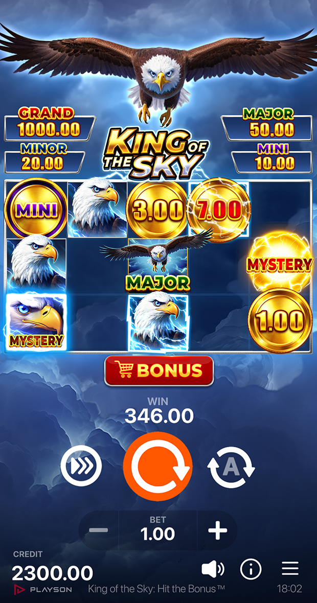 King of the Sky: Hit the Bonus™ captivates with stunning sky-themed visuals and immersive audio. Watch storm clouds roll in, lightning flash, and eagles soar across the reels as anticipation builds with every spin. With high volatility and a sky-high max win, this slot delivers a premium, high-stakes experience for thrill-seeking players.